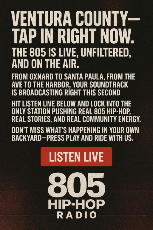 Ventura County—tap in right now. The 805 is live, unfiltered, and on the air. From Oxnard to Santa Paula, from the Ave to the Harbor, your soundtrack is broadcasting right this second. Hit LISTEN LIVE below and lock into the only station pushing real 805 Hip‑Hop, real stories, and real community energy. Don’t miss what’s happening in your own backyard—press play and ride with us.